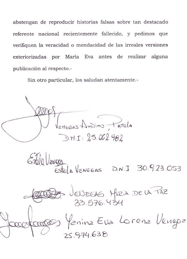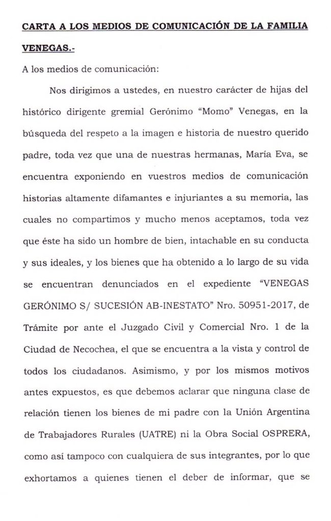 «Nos dirigimos a ustedes, en nuestro carácter de hijas del histórico dirigente gremial Gerónimo «Momo» Venegas, en la búsqueda del respeto a la imagen e historia de nuestro querido padre, toda vez que una de nuestras hermanas, María Eva, se encuentra exponiendo en vuestros medios de comunicación historias altamente difamantes e injuriantes a su memoria, las cuales no compartimos y mucho menos aceptamos, toda vez que este ha sido un hombre de bien, y los bienes que ha obtenido a lo largo de su vida se encuentran denunciadas en el expediente «VENEGAS GERÓNIMO S/SUCESIÓN AB-INESTATO» Nro 50951-2017, de trámite ante el Juzgado Civil y Comercial N° 1 de la Ciudad de Necochea, el que se encuentra a la vista y control de todos los ciudadanos. Asimismo y por los mismos motivos antes expuestos, es que debemos aclarar que ninguna clase de relación tienen los bienes de mi padre con la Unión de Trabajadores Rurales (UATRE) ni la obra social OSPRERA, como así tampoco con cualquiera de sus integrantes, por lo que exhortamos a quienes tienen el deber de informar, que se abstengan de reproducir historias falsas sobre tan destacado referente nacional recientemente fallecido, y pedimos que verifiquen la veracidad o mendacidad de las irreales versiones exteriorizadas por María Eva antes de realizar alguna publicación al respecto».