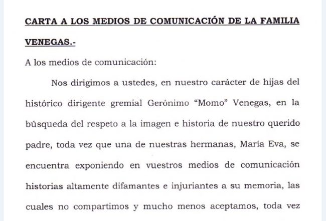 «Nos dirigimos a ustedes, en nuestro carácter de hijas del histórico dirigente gremial Gerónimo «Momo» Venegas, en la búsqueda del respeto a la imagen e historia de nuestro querido padre, toda vez que una de nuestras hermanas, María Eva, se encuentra exponiendo en vuestros medios de comunicación historias altamente difamantes e injuriantes a su memoria, las cuales no compartimos y mucho menos aceptamos, toda vez que este ha sido un hombre de bien, y los bienes que ha obtenido a lo largo de su vida se encuentran denunciadas en el expediente «VENEGAS GERÓNIMO S/SUCESIÓN AB-INESTATO» Nro 50951-2017, de trámite ante el Juzgado Civil y Comercial N° 1 de la Ciudad de Necochea, el que se encuentra a la vista y control de todos los ciudadanos. Asimismo y por los mismos motivos antes expuestos, es que debemos aclarar que ninguna clase de relación tienen los bienes de mi padre con la Unión de Trabajadores Rurales (UATRE) ni la obra social OSPRERA, como así tampoco con cualquiera de sus integrantes, por lo que exhortamos a quienes tienen el deber de informar, que se abstengan de reproducir historias falsas sobre tan destacado referente nacional recientemente fallecido, y pedimos que verifiquen la veracidad o mendacidad de las irreales versiones exteriorizadas por María Eva antes de realizar alguna publicación al respecto».