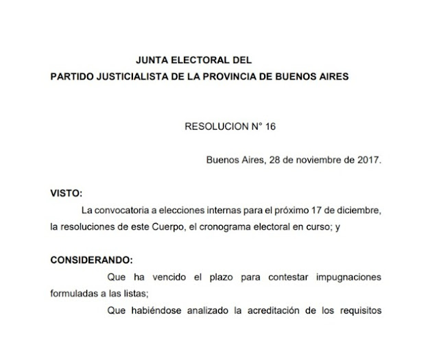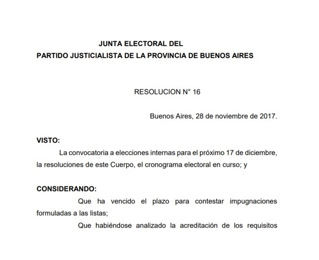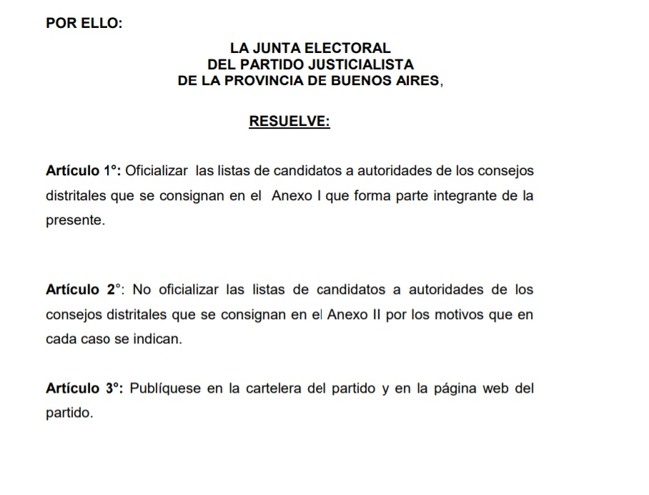 En una resolución de la Junta Electoral del Partido Justicialista de la provincia de Buenos Aires, se decidió la suerte de varias listas presentadas en varios distritos de la jurisdicción, entre ellas las dos presentadas en Necochea.