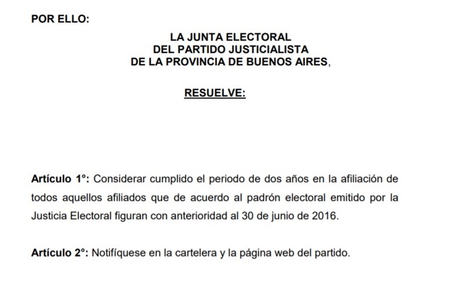 La mencionada resolución «considera cumplido el período de dos años en la afiliación de todos aquellos afiliados que de acuerdo al padrón electoral emitido por la Justicia Electoral figuran con anteiroridad al 30 de junio de 2016».