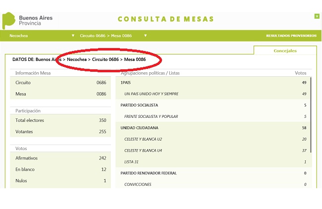 De los 255 electores que hubo en la mesa 86 de Necochea, Esteban Bullrich sumó 121 votos para senador nacional. Arturo Rojas sufrió un corte abrupto de 43 votos, resultando ganador aquí su contrincante Gonzalo Diez con 71 votos.