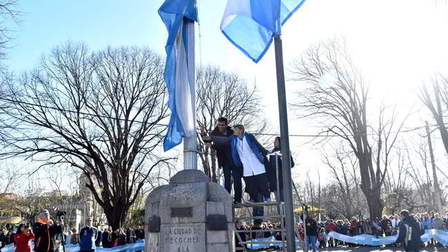 Antes de los discursos, se entonaron las estrofas del Himno Nacional Argentino, al ritmo de la Banda Municipal, y se izó la bandera del mástil central de la plaza, a cargo del propio intendente Facundo López y alumnos de diferentes colegios.