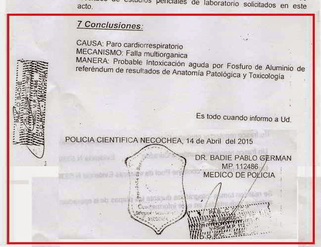 De la movilización, participaron la madre y el esposo de la joven quienes dieron a conocer el dictamen de la policía científica de Necochea donde se certifica que falleció «por un paro cardiorespiratorio que le provocó una falla multiorganica», debido a una «probable Intoxicación aguda por Fosfuro de Aluminio de referéndum de resultados de Anatomía Patológica y Toxiología».