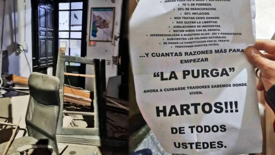 El local del Frente de Todos fue destrozado por el material explosivo arrojado, el que provocó importantes daños en las instalaciones y en los comercios y edificios linderos. En el lugar se encontraron panfletos con amenazas de muerte para los militantes. Uno de ellos anticipa el comienzo de “la purga” contra los políticos y advierte: “Ahora a cuidarse, traidores. Sabemos dónde viven. ¡Hartos! de todos ustedes”.