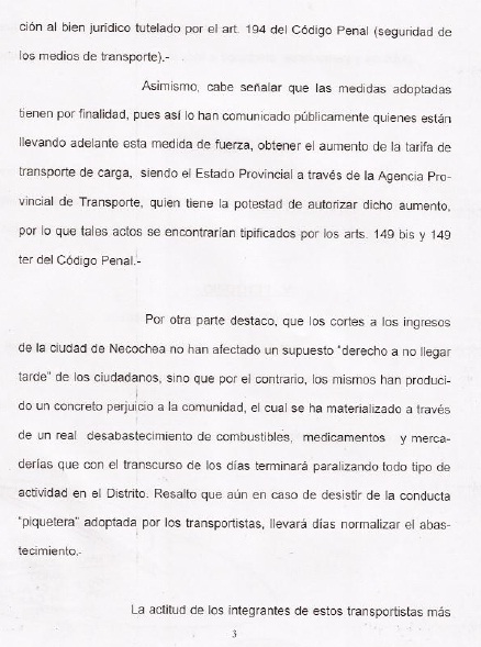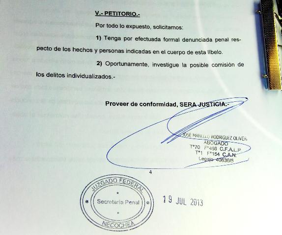En la misma se denuncia acciones que permitieron el desabastecimiento de productos alimenticios y combustibles a la ciudad de Necochea, como así que “quedaron vulneradas las garantías de libre circulación y seguridad de las personas”.