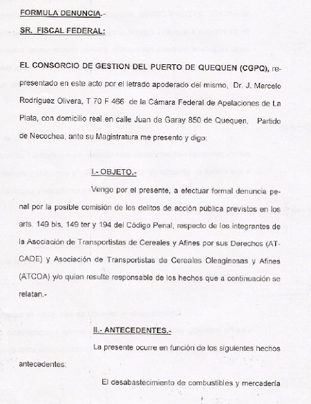 Jose Luis De Gregorio, Presidente del Consorcio de Gestión del Puerto Quequén, presentó en el día de hoy una denuncia en el Juzgado Federal, a través de su apoderado Marcelo Rodriguez Olivera.