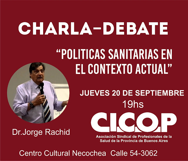 La Asociacion de Profesionales de Necochea seccional CICOP, invita a la comunidad toda a la Charla-Debate “Políticas Sanitarias en el contexto actual”, que tendrá como protagonista al Dr. Jorge Rachid, medico sanitarista de amplia trayectoria.