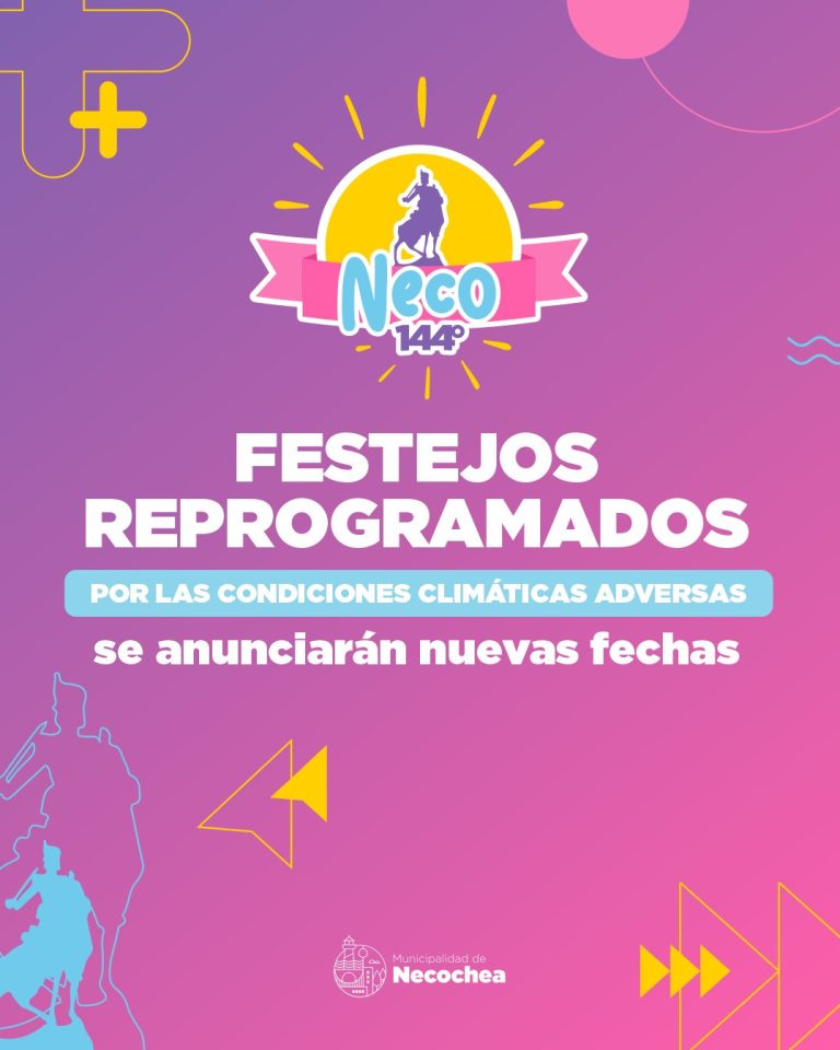 Atendiendo a la cuestión climática, con un pronóstico extendido que prevé vientos, lluvias y chaparrones para los días venideros en la ciudad, la Municipalidad informa que han sido postergados los festejos por el 144º aniversario de Necochea.