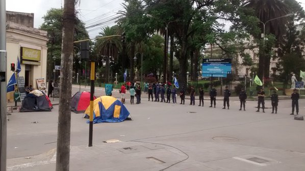 La policía provincial montó un fuerte operativo de seguridad en torno a la vivienda de Sala, así como en la plaza Belgrano donde permanecían algunos de sus seguidores con el campamento que montaron contra las medidas de Morales.