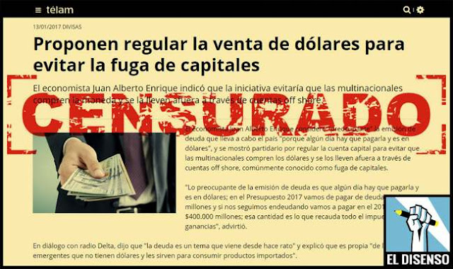 En la jornada de ayer la Agencia Telam, por motivos que se desconocen, bajó de su portal una nota que había publicado apenas unas horas antes. El artículo suprimido se corresponde con el cable 446130 de la agencia, que consistía en una reseña relativa a las preocupaciones y propuestas del economista Juan Enrique respecto al endeudamiento y la fuga de capitales. Para profundizar sobre la cuestión que podría haber incomodado a algún funcionario nos pusimos en contacto con el economista, quien nos expresó la necesidad de regular el mercado cambiario para reducir la fuga de capitales.