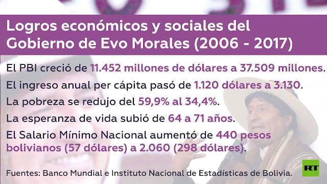 Según datos del Banco Mundial, en 2006 el Producto Bruto Interno (PBI) boliviano era de 11.452 millones de dólares. Para 2017 ese número había aumentado más de tres veces llegando a 37.509 millones. En el mismo período de tiempo, el ingreso anual per cápita pasó de 1.120 dólares a 3.130 y la esperanza de vida subió de 64 a 71 años. A su vez, el Instituto Nacional de Estadísticas (INE) del país, sostiene que la pobreza se redujo del 59,9% cuando asumió Evo Morales al 36,4% el año pasado.