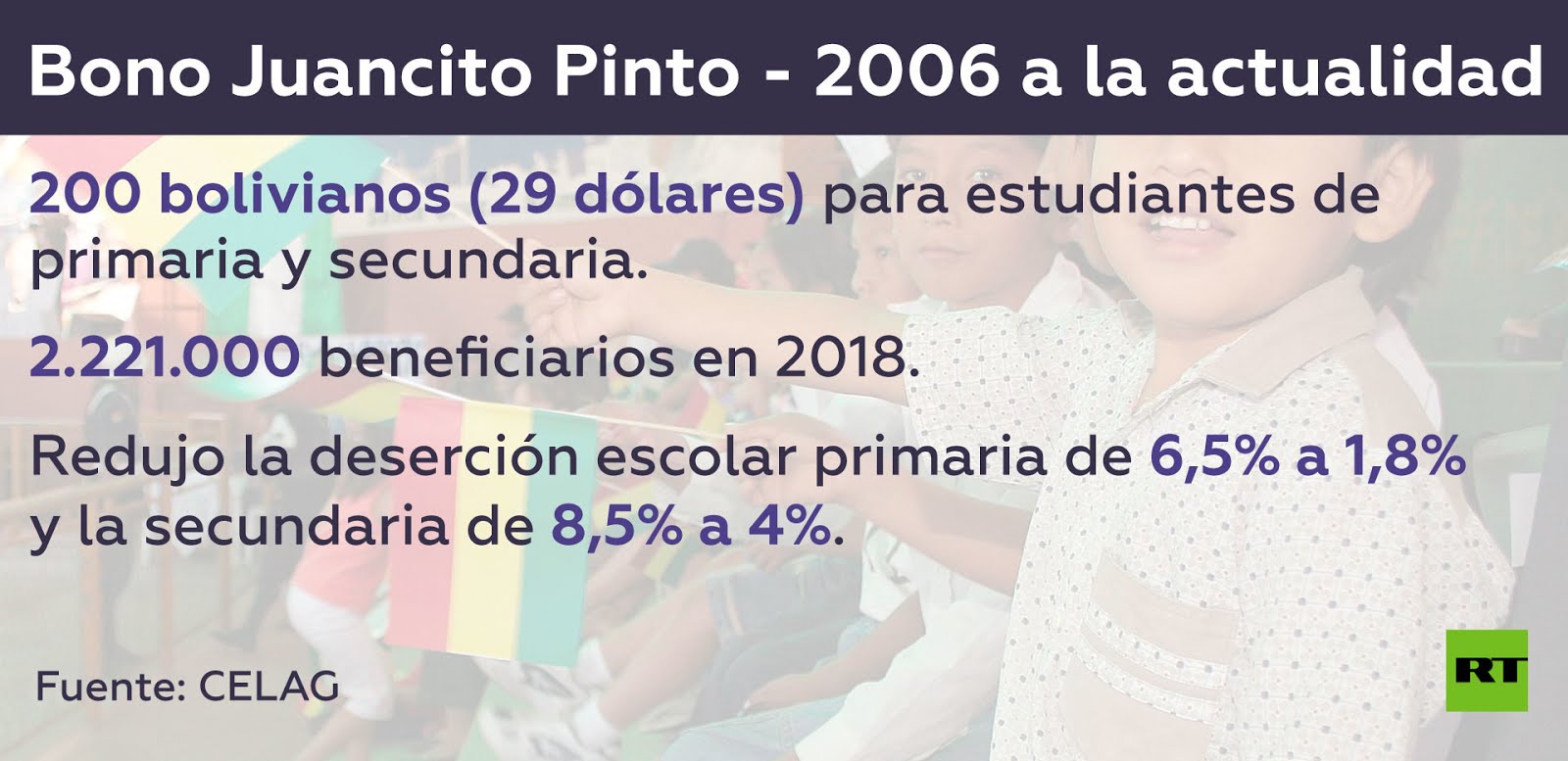El primero de estos fue lanzado durante el primer año de Gobierno y apunta a que los niños y niñas finalicen la escuela. Supone un aporte de 200 bolivianos (29 dólares) a estudiantes de escuelas públicas a cambio de que sostengan un mínimo de un 80% de asistencia a clases. Durante 2018 hubo 2.221.000 de estudiantes beneficiados por esta iniciativa. A su vez, esto logró que entre 2006 y 2017 la deserción escolar en primaria cayese del 6,5% al 1,8% y en la educación secundaria fue del 8,5% al 4%.