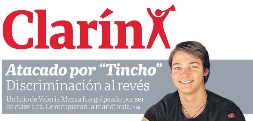 En la portada de la edición publicada el miércoles 8 de junio, el Diario Clarín utilizó el término “discriminación al revés” para referirse al violento ataque que sufrió Tiziano Gravier, el hijo de la modelo Valeria Mazza y el empresario Alejandro Gravier, en un boliche de Rosario. La bajada describía: «Un hijo de Valeria Mazza fue golpeado por ser de clase alta. Le rompieron la mandíbula».
