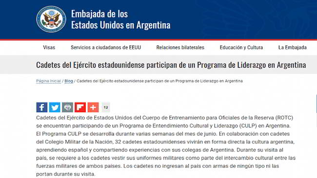 La Embajada de Estados Unidos el día 11 de junio publicó en su portal web información donde explicaba que militares estadounidenses estarían participando «de un Programa de Entendimiento Cultural y Liderazgo (CULP) en Argentina» durante todo el mes de junio con el fin de vivir la «inmersión en la cultura» del país suramericano y además advertían de que «Durante su visita al país, se requiere a los cadetes vestir sus uniformes militares como parte del intercambio cultural entre las fuerzas militares de ambos países». La nota concluía señalando que «Los cadetes no ingresan al país con armas de ningún tipo ni las portan durante su visita».
