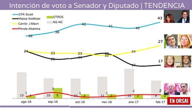 Una encuesta reciente de consultora DICEN parece corroborar este escenario. Allí se puede observar que la dupla legislativa de Cristina Kirchner y Daniel Scioli obteniendo el 43% contra un 27% de Carrió y Jorge Macri de cambiemos y 17% del hipotético frente entre Massa y Stolbizer. En un escenario de internas en el peronismo, la dupla CFK-SCIOLI obtendría un 34% contra poco menos del 10% de Randazzo y Domínguez.