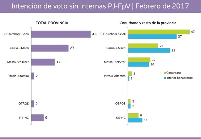 Una encuesta reciente de consultora DICEN parece corroborar este escenario. Allí se puede observar que la dupla legislativa de Cristina Kirchner y Daniel Scioli obteniendo el 43% contra un 27% de Carrió y Jorge Macri de cambiemos y 17% del hipotético frente entre Massa y Stolbizer. En un escenario de internas en el peronismo, la dupla CFK-SCIOLI obtendría un 34% contra poco menos del 10% de Randazzo y Domínguez.
