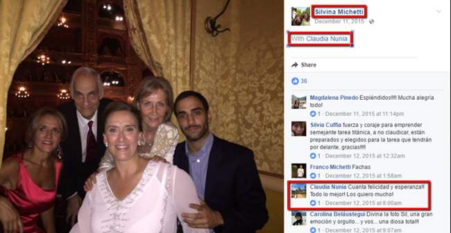 Claudia del Valle Nunia definió a su relación con Michetti como “un vínculo” con Silvina Michetti, a quién declaró conocer en el 2001 realizando un posgrado. Pero Claudia es mucho mas que una simple amiga, y su “vínculo” no es solamente con la hermana de la vicepresidenta, como deja en claro en este mensaje hacia los Michetti a quienes “Los quiere mucho!”.