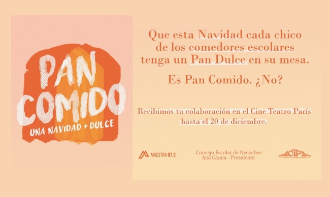 «Pan Comido, una Navidad + dulce» se llama el proyecto solidario, el cual se propone «que esta Navidad cada chico de los comedores escolares tenga un Pan Dulce en su mesa. Es Pan Comido ¿no?. Recibimos tu colaboración en el Cine Teatro París hasta el 20 de diciembre».