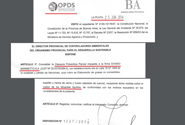 En junio de 2014, el OPDS (Organismo Provincial de Desarrollo Sostenible) ya había clausurado a la empresa Evasio Marmetto S.A. por haber constatdo irregularidades e incumplimientos a las normativas ambientales vigentes.