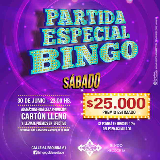 Mañana, a partir de las 23hs, en Bingo Golden Palace tenemos dos opciones para un plan perfecto con tus amigos. Llega una nueva Partida Especial de Bingo y con ella la posibilidad de ganarte un premio aproximado de $25.000 en efectivo, poniéndose en juego el 10% del pozo acumulado a bolilla libre. Además, los premios de siempre y la promoción “Cartón lleno”.