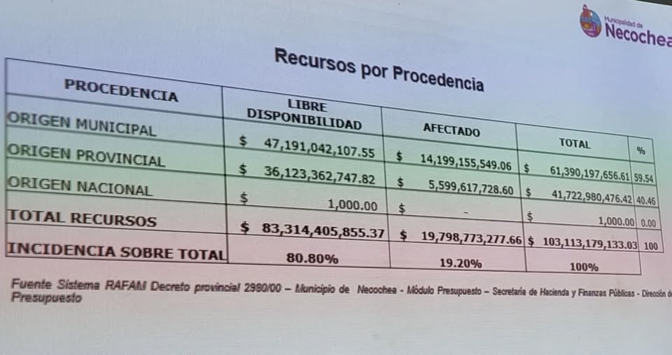 De acuerdo a esa presentación, el esquema de financiamiento quedaría conformado mayoritariamente por recursos propios y provinciales: un 59% correspondería a fondos municipales y un 40% a transferencias de la Provincia de Buenos Aires. El aporte nacional, en cambio, se reduciría a una cifra simbólica: mil pesos para todo el distrito.