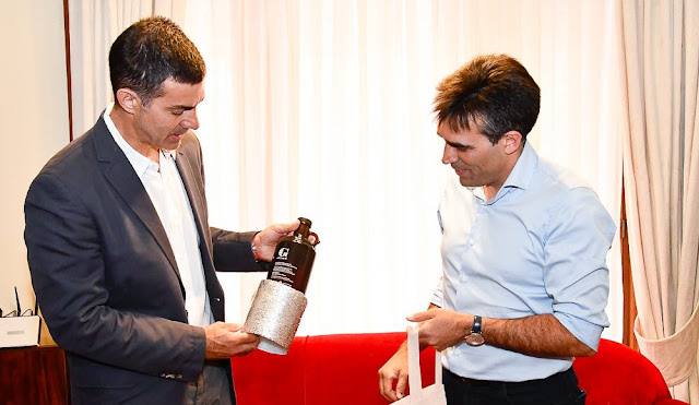 El obsequio estuvo compuesto por un kit de la cerveza artesanal Geiser, listo para su degustación, algunos de los riquísimos alfajores de la distinguida firma Dolche Patagonia y los representativos tambores de Dulce de Leche Campero, con los cuales el Gobernador estuvo entretenido un buen rato.