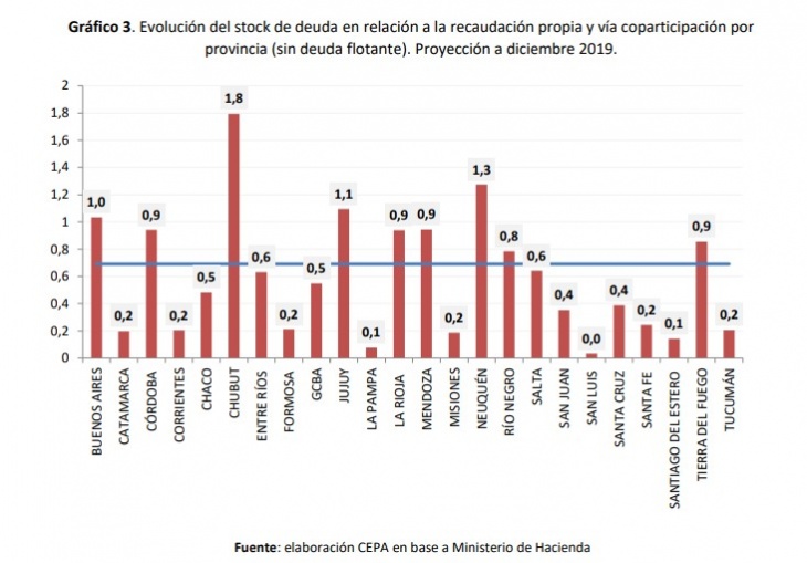 Pero, ¿cómo está Buenos Aires frente a otras provincias? En principio, mal. Es una de las tres que peor relación entre deuda y recaudación presenta, por detrás de Jujuy, de Neuquen y de Chubut, que por estas horas atraviesa una difícil crisis política derivada del sobreendeudamiento al que se sometió en los últimos años.