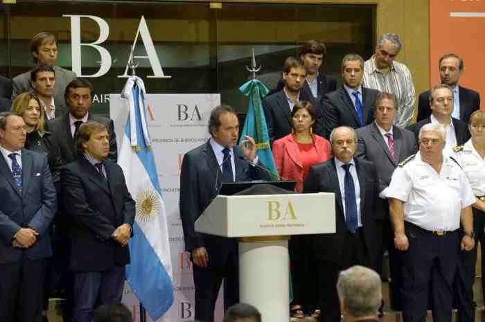 Capital Federal.- El gobernador Daniel Scioli decretó hoy la emergencia en materia de Seguridad Pública por 12 meses, en todo el territorio provincial, durante una conferencia de prensa que brindó en la Casa de la Provincia, acompañado por todo su gabinete.