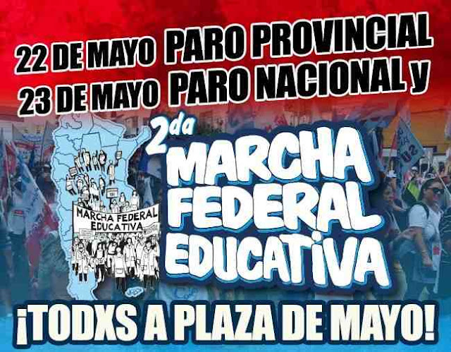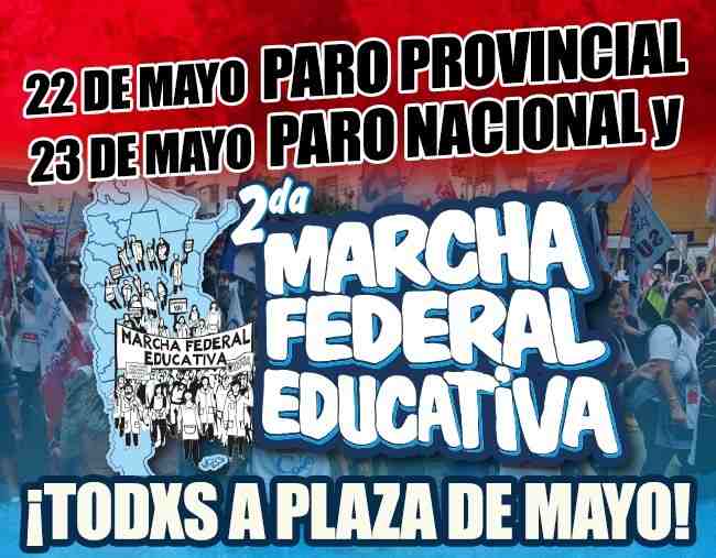 Sin convocatoria y con una última propuesta que conlleva la pérdida creciente del poder adquisitivo del salario, el próximo 22 de mayo se realizará PARO PROVINCIAL y el 23 de mayo, adheriendo al PARO NACIONAL convocado por CTERA, marchamos a plaza de Mayo acompañando la MARCHA FEDERAL EDUCATIVA que recorrerá todo el país los días 21, 22 y 23 de mayo
