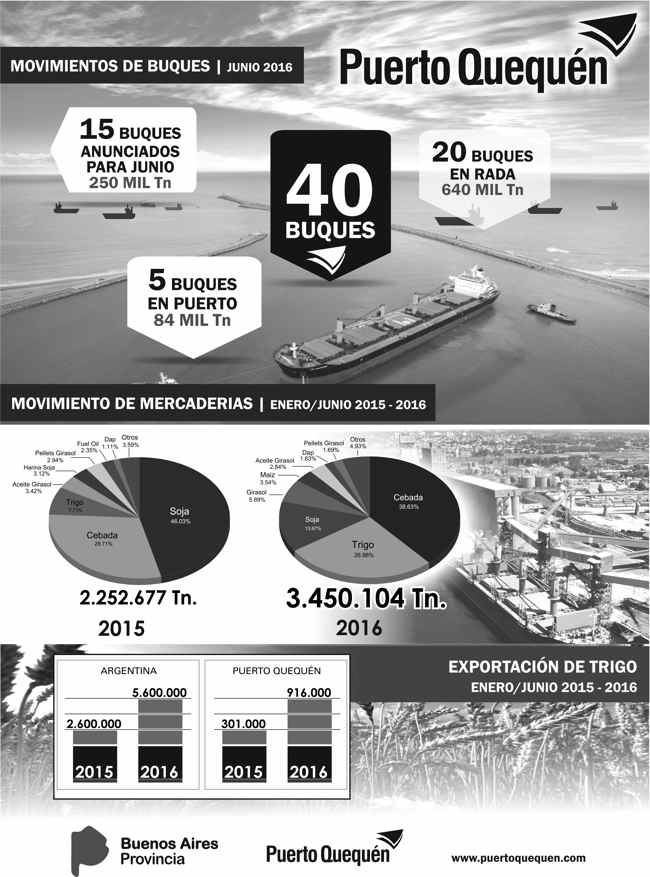 En el primer semestre de 2016, Puerto Quequén, con 916 mil toneladas, triplicó las toneladas de trigo exportadas durante todo el 2015. El acumulado anual del cereal durante el año pasado había alcanzado sólo 301 mil toneladas.