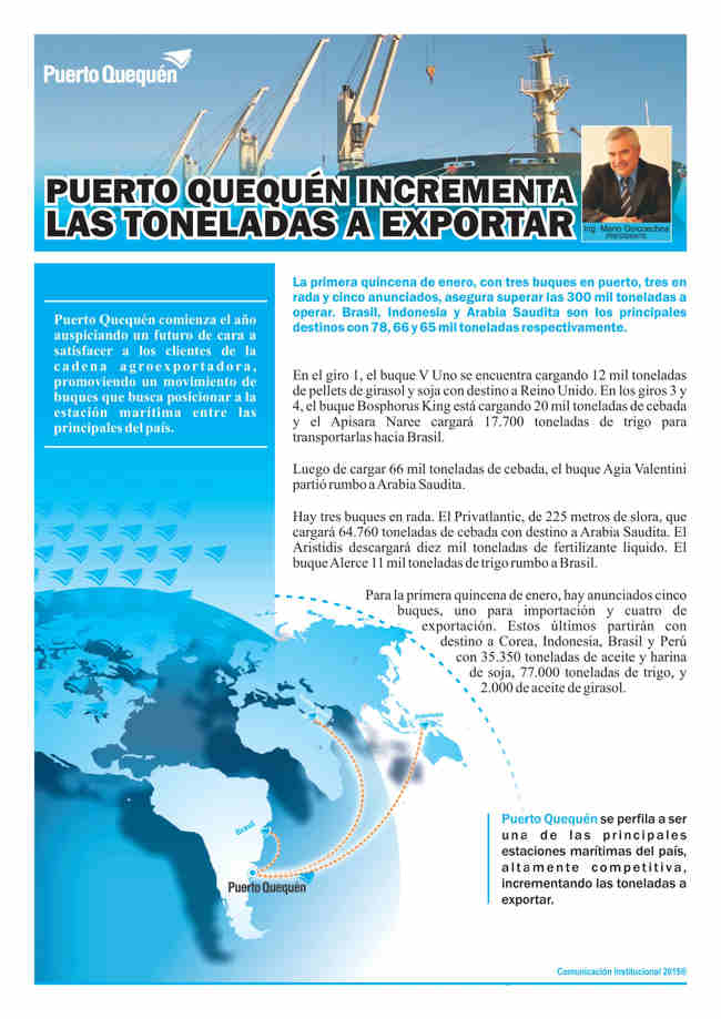 Puerto Quequén se perfila a ser una de las principales estaciones marítimas del país, altamente competitiva, incrementando las toneladas a exportar.