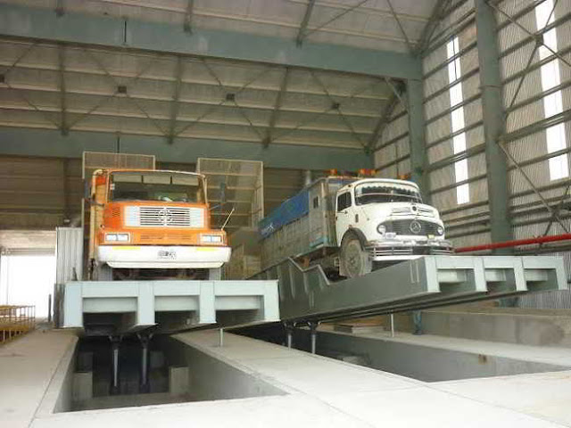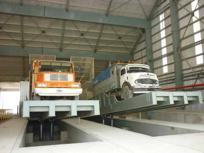 Asimismo, está listo el edificio de descarga de camiones, con una reja y seis plataformas volcadoras, que vuelcan a sus respectivas tolvas subterráneas para encausar el producto a la cinta transportadora. Inicialmente, tres estarán operativas con una velocidad de descarga individual de 10 camiones/hora, es decir, 30 camiones por hora en total. Próximamente, recibirán las balanzas de camiones.