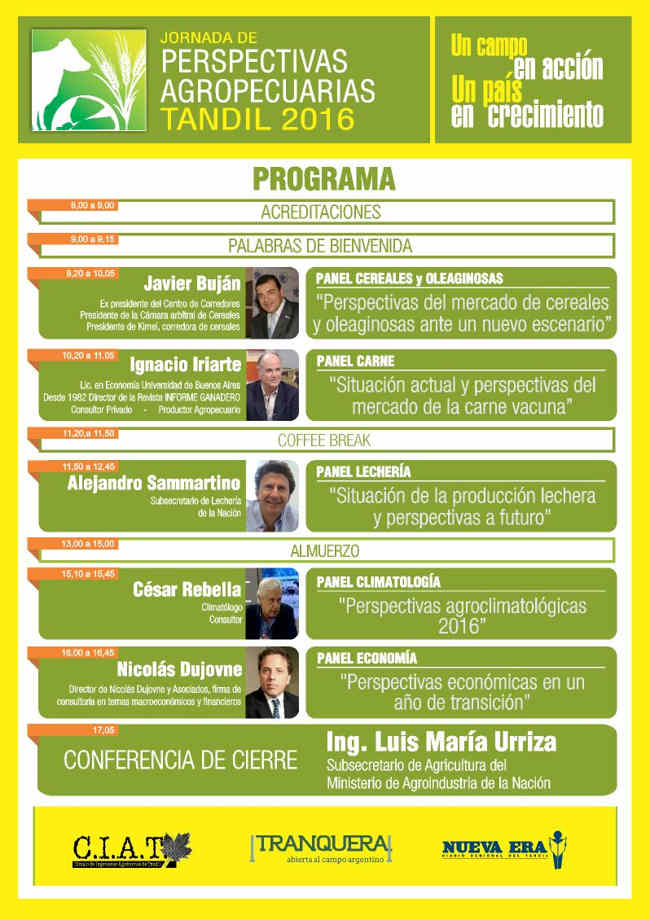 Durante la tarde el climatólogo César Rebella expondrá las “Perspectivas agroclimáticas 2016”y el economista Nicolás Dujovne hará lo propio con las “Perspectivas económicas en un año de transición”.
