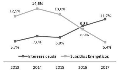 Cuando analizamos en qué utilizó el Estado lo que ahorró con la reducción de los subsidios el tema pasa a ser un poco más áspero: la reducción del peso de los subsidios energéticos en el gasto estatal (del 13% a 5,4% entre 2015 y 2017) fue compensado por un incremento del peso de los intereses (del 6,8% al 11,7% en el mismo período).