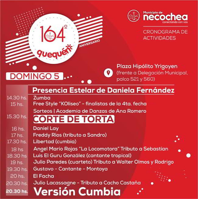 En tanto que el domingo, será el corte de torta a las 15:30 con la presencia de las autoridades municipales, para que a las 20:30 el cierre definitivo esté a cargo de Versión Cumbia.