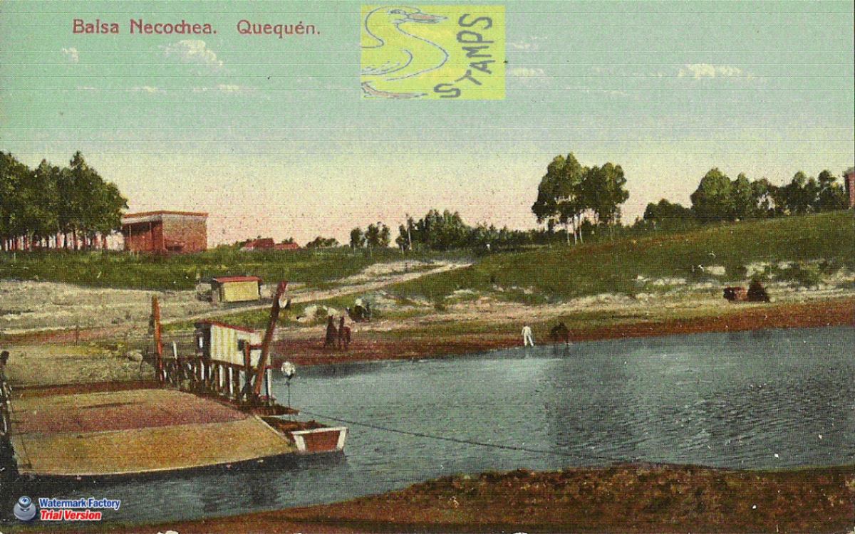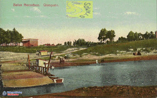 En la imagen de referencia que aquí se reproduce, se puede apreciar en detalle la vida bucólica en la ribera del río Quequén, con un muelle y una balsa para cruzar el río.