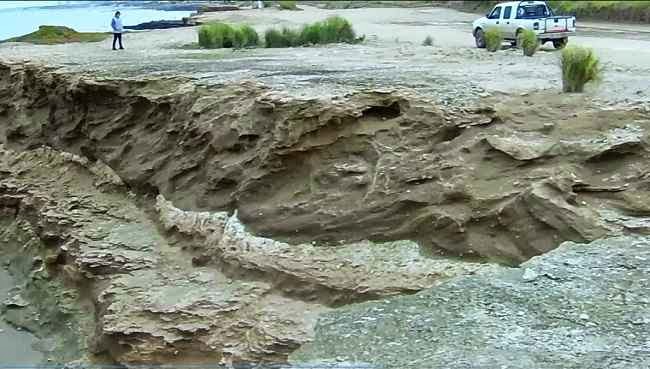 Con la bajante de la marea surge a la vista otro gran problema, común en toda la costa bonaerense: la erosión marina. Despiadada, la acción del mar no tiene contemplaciones y avanza metro a metro cada año.
