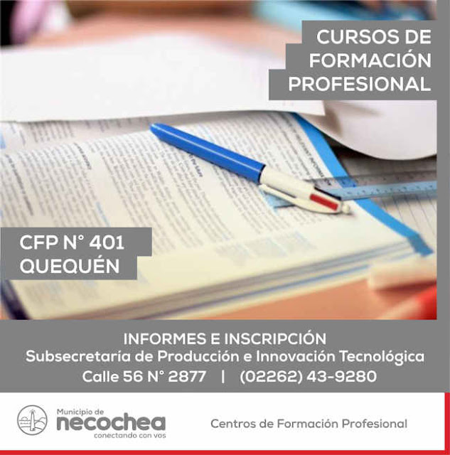A través de un convenio rubricado con los centros de Formación Profesional locales, a través de la Inspección de la Modalidad Educación de Adultos, que busca fortalecer y divulgar las capacitaciones ofrecidas desde estas instituciones, la Subsecretaría de Producción e Innovación Tecnológica informa que ya están abiertas las inscripciones para participar en los cursos planificados por el CFP N° 401 de Quequén.