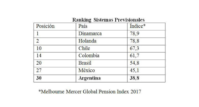 Los datos resultan de una publicación del Australian Centre for Financial Studies del Escuela de Negocios Monash, en el que se presenta el «2017 Melbourne Mercer Global Pension Index» (Índice) que analiza y compara los sistemas de pensión una treintena de naciones entre los que se encuentra la Argentina.