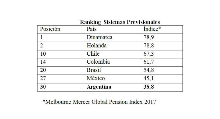 Los datos resultan de una publicación del Australian Centre for Financial Studies del Escuela de Negocios Monash, en el que se presenta el «2017 Melbourne Mercer Global Pension Index» (Índice) que analiza y compara los sistemas de pensión una treintena de naciones entre los que se encuentra la Argentina.