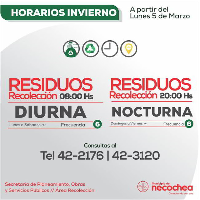 El área de Recolección de Residuos, a cargo de Adrián Ciancaglini y dependiente de la Secretaría de Planeamiento, Obras y Servicios Públicos, , anuncia que a partir del próximo lunes 5 el operativo domiciliario vuelve a los horarios de invierno, al tiempo que finalizan los refuerzos de temporada en la Villa Balnearia.