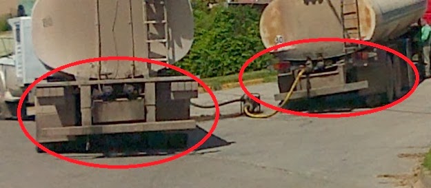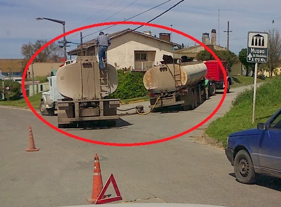 En las fotos se puede observar el operativo en acción: a plena luz del día, dos camiones sin la debida chapa patente y con las inscripciones de advertencia de peligrosidad ocultas para no alarmar a la población.