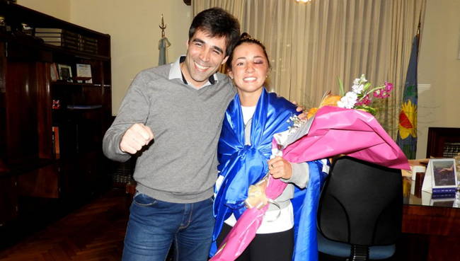 Luego de una velada histórica para el deporte de Necochea, el intendente abrió su despacho para que todos juntos puedan agasajar a la joven de 26 años, quien logró la gran proeza de su corta carrera al arrebatarle el título a Débora Dionicius, en Concordia, Entre Ríos, y sólo seis meses después de haber sido campeona sudamericana.