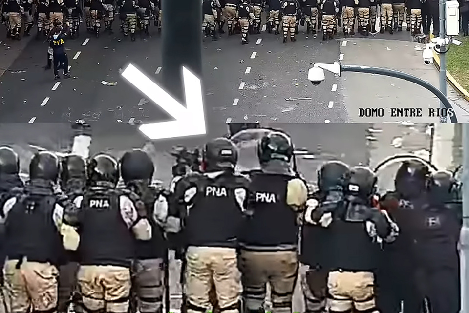 El trabajo de Mapa de la Policía fue clave para identificar al agresor. Gracias a registros de manifestantes, fotorreporteros y una cámara de vigilancia del Congreso —conocida como “domo Entre Ríos”— se pudo ver al prefecto caminando en puntas de pie detrás de la primera línea, con una marca blanca en el casco (indicativo del uso de Byrna TCR). El disparo ocurrió a las 17.21 y fue directo a la cara. Otras imágenes lo muestran atacando de manera similar a más personas, en franca violación de los protocolos.