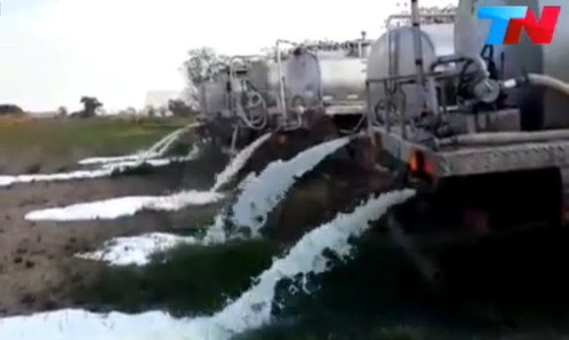 Estas son las imágenes que no se querían ver: el derramamiento de treinta mil litros de leche en Villa Trinidad, en Suardi, provincia de Santa Fe. Se trata solamente de una parte de los miles de litros que ya fueron arrojados en las últimas horas.
