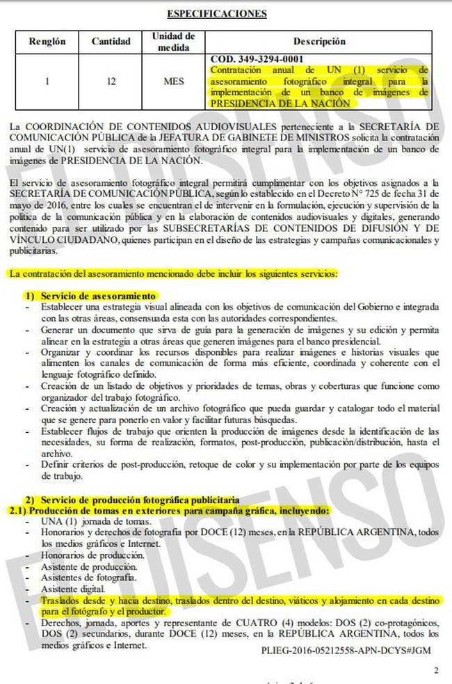 De acuerdo a la licitación privada arreglada por el Jefe de Gabinete Marcos Peña Braun, el estudio del fotógrafo que quedó varado ayer en alta montaña, debe realizar servicios de asesoramiento y de  producción fotográfica publicitaria con “producción de tomas en exteriores para campaña gráfica” y “producción de tomas en estudio” que incluyen “Traslados desde y hacia destino, traslados dentro del destino, viáticos y alojamiento en cada destino” para el fotógrafo, el productor, equipamiento y equipo técnico.
