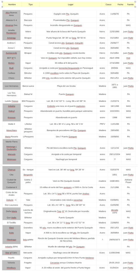 En este sentido, la Fundación Histamar realizó, entre otras cosas, un profundo trabajo de investigación y recopilación de los naufragios en las costas de esta región. A continuación, un listado elaborado por dicha fundación, donde se pueden encontrar datos interesantes sobre los más de 50 embarcaciones que finalizaron su recorrido en forma accidental en nuestras costas.