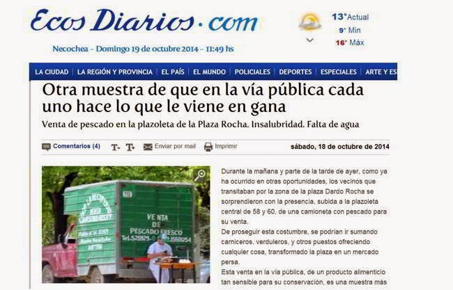 A modo de denuncia, informó sobre la existencia en la Plaza Dardo Rocha de una camioneta destinada a la venta de pescado, cuestionando seriamente “la calidad de lo que se expende y si este alimento cuenta con la debida refrigeración, sin que se corte la cadena de frío”. (http://www.ecosdiariosweb.com.ar/m/nota.asp?id=31911)