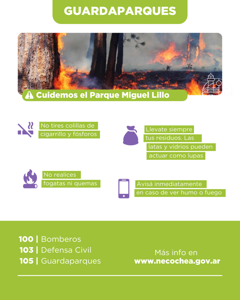 Desde la Dirección de Guardaparques se advierte que, durante la jornada de hoy, el riesgo de incendios es extremo en el ámbito del Parque Miguel Lillo y en sectores de pastizales del distrito, como consecuencia de las condiciones climáticas y el alto nivel de sequedad del suelo.