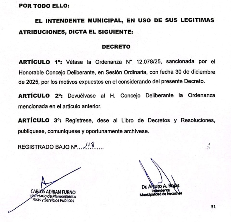 El veto del intendente de Necochea a la Ordenanza 12.078/25, mediante el Decreto Nº 118/26, volvió a colocar en el centro de la escena política local el futuro del Complejo Casino. La norma vetada había introducido modificaciones al marco que regula la subasta del inmueble, pero el Ejecutivo decidió retrotraer el proceso a la ordenanza original, argumentando razones de legalidad y coherencia administrativa.